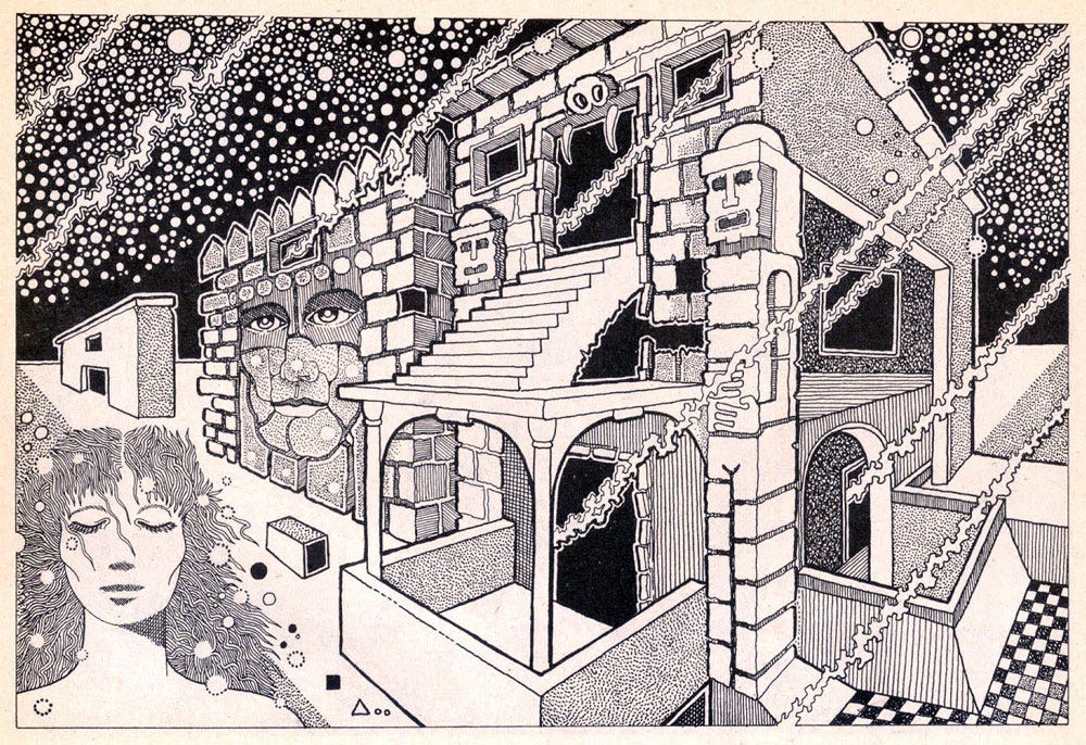 it’s conceivable that a party at that time and place, in that circle, might have had in attendance Orfali, Griffith, R. Crumb, RAW, George Kuchar, and some of those gay LSD makers/distributors that Erik Davis wrote about in Blotter. Also Terence McKenna, Nick Herbert, Jeffrey Mishlove, Aline Crumb, Jacques Vallee, Grady McMurtry, and who knows who else.